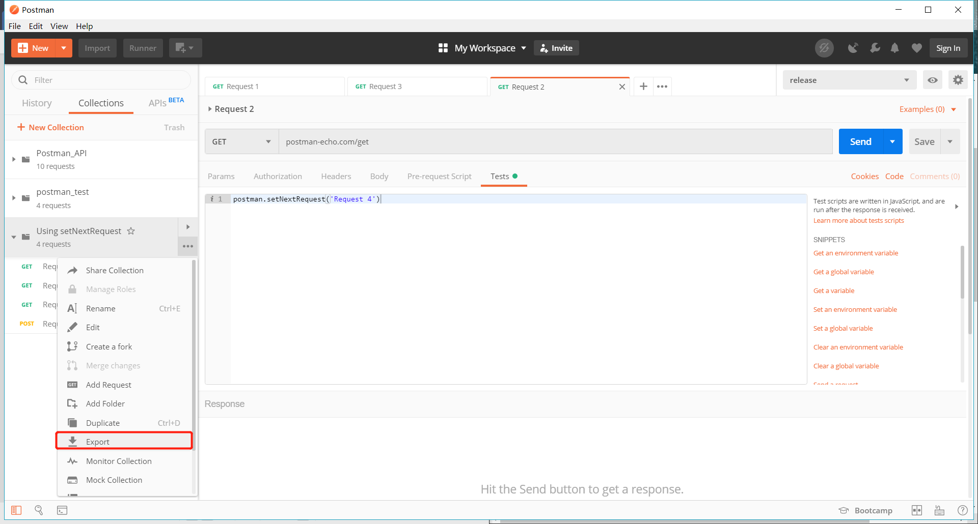 首先在第一个请求Request1中Test代码栏中编辑如下代码,表示下一个请求为Request3