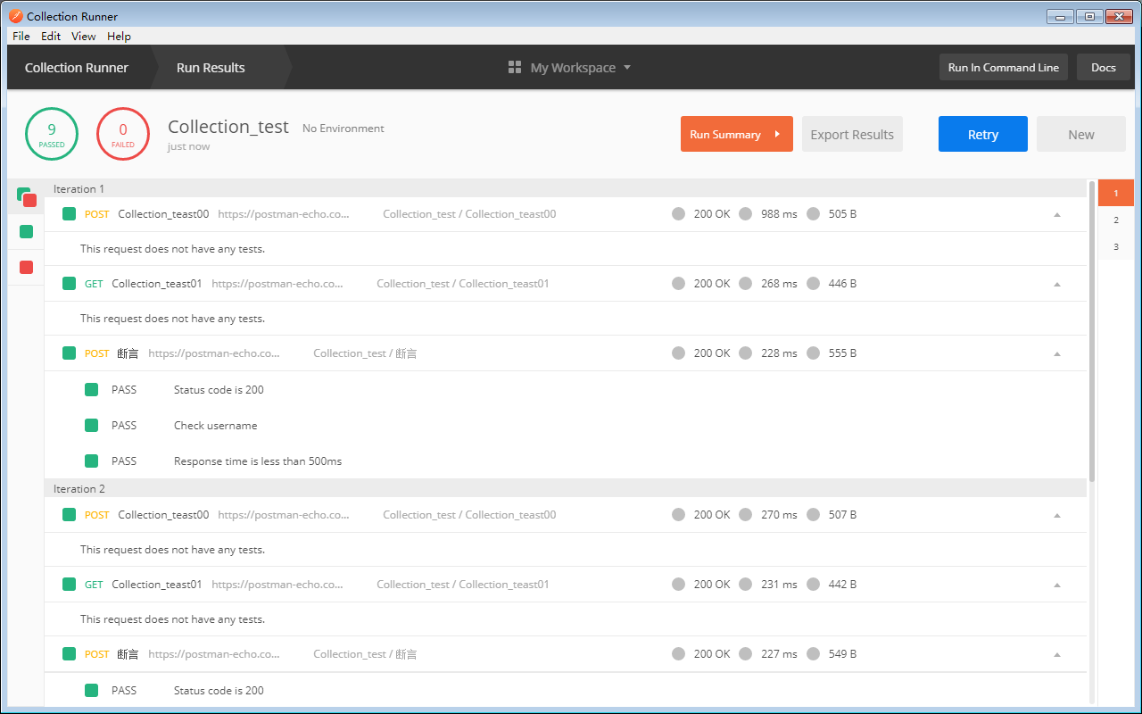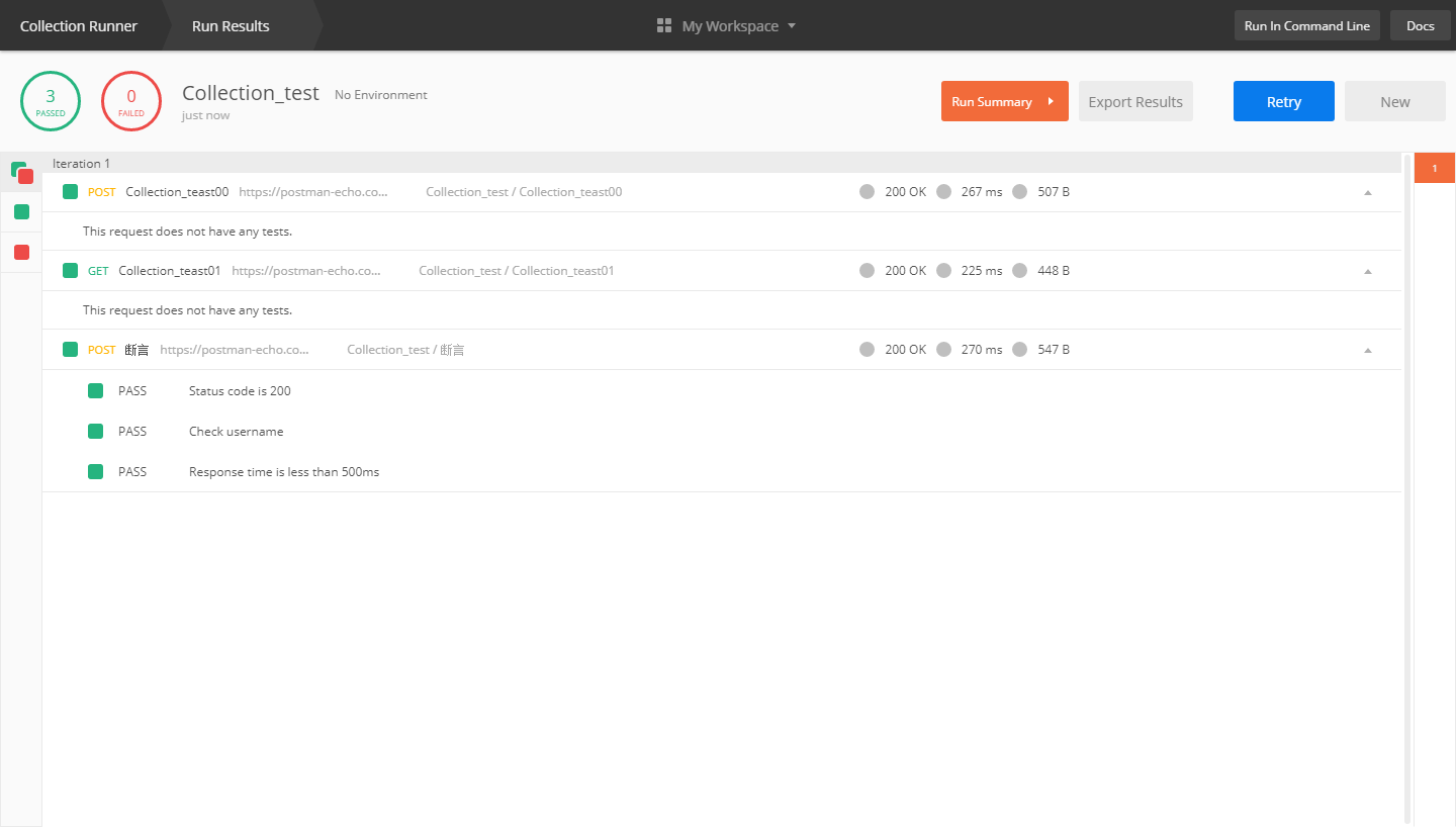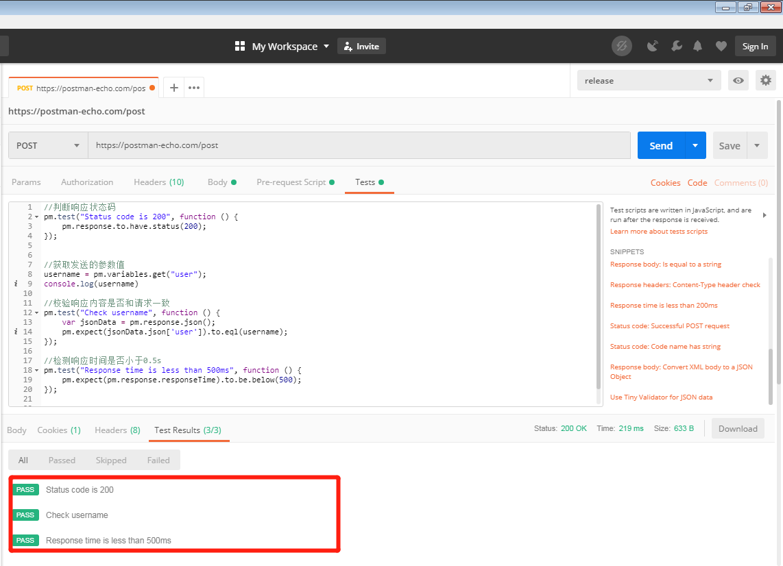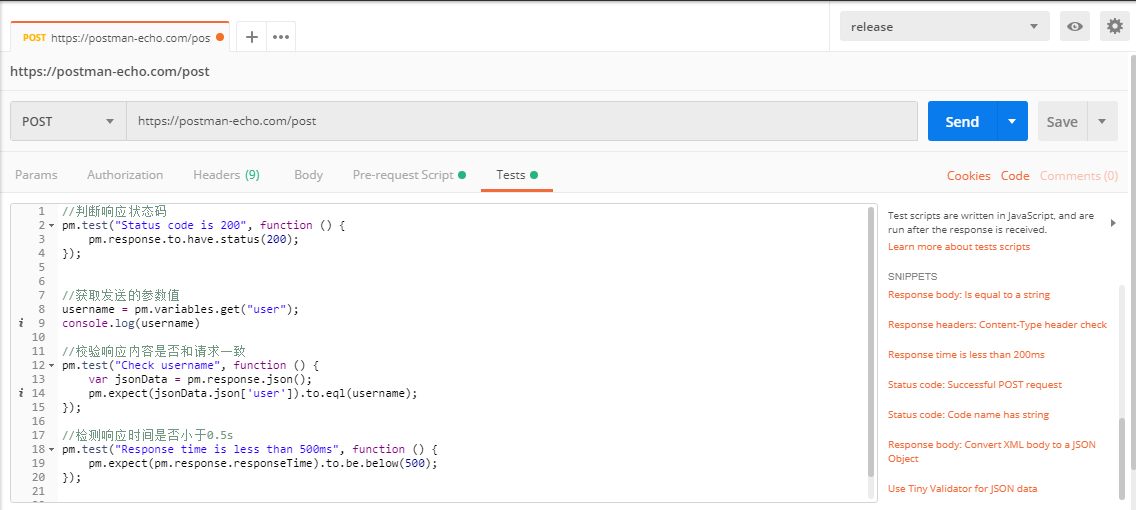 //判断响应状态码 pm.test("Status code is 200", function () { pm.response.to.have.status(200); }); //获取发送的参数值 username = pm.variables.get("user"); console.log(username) //校验响应内容是否和请求一致 pm.test("Check username", function () { var jsonData = pm.response.json(); pm.expect(jsonData.json['user']).to.eql(username); }); //检测响应时间是否小于0.5s pm.test("Response time is less than 500ms", function () { pm.expect(pm.response.responseTime).to.be.below(500); });