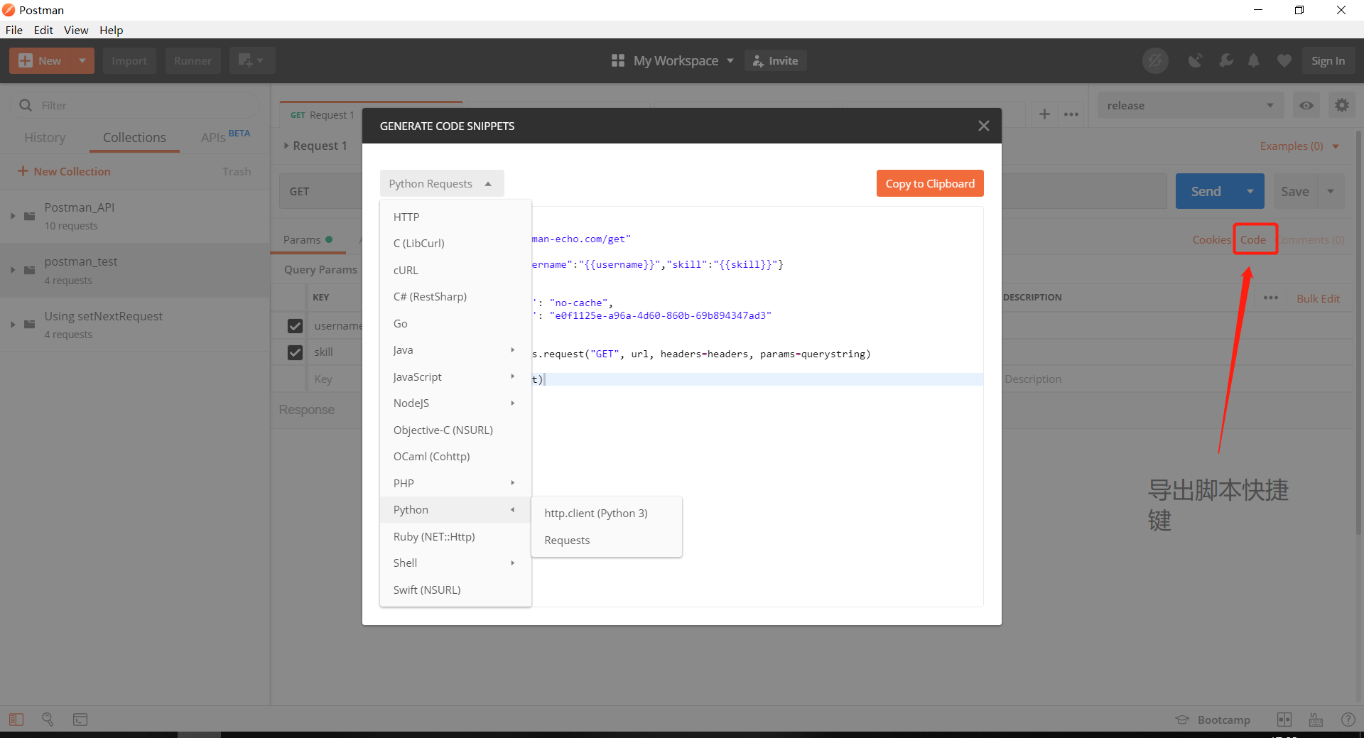 Postman支持导出不同语言版本的脚本,到一个接口调试好之后,点击右侧的code字样即弹出图下界面可以选择语言。最后你需要选择语言版本即可生成对应的代码。