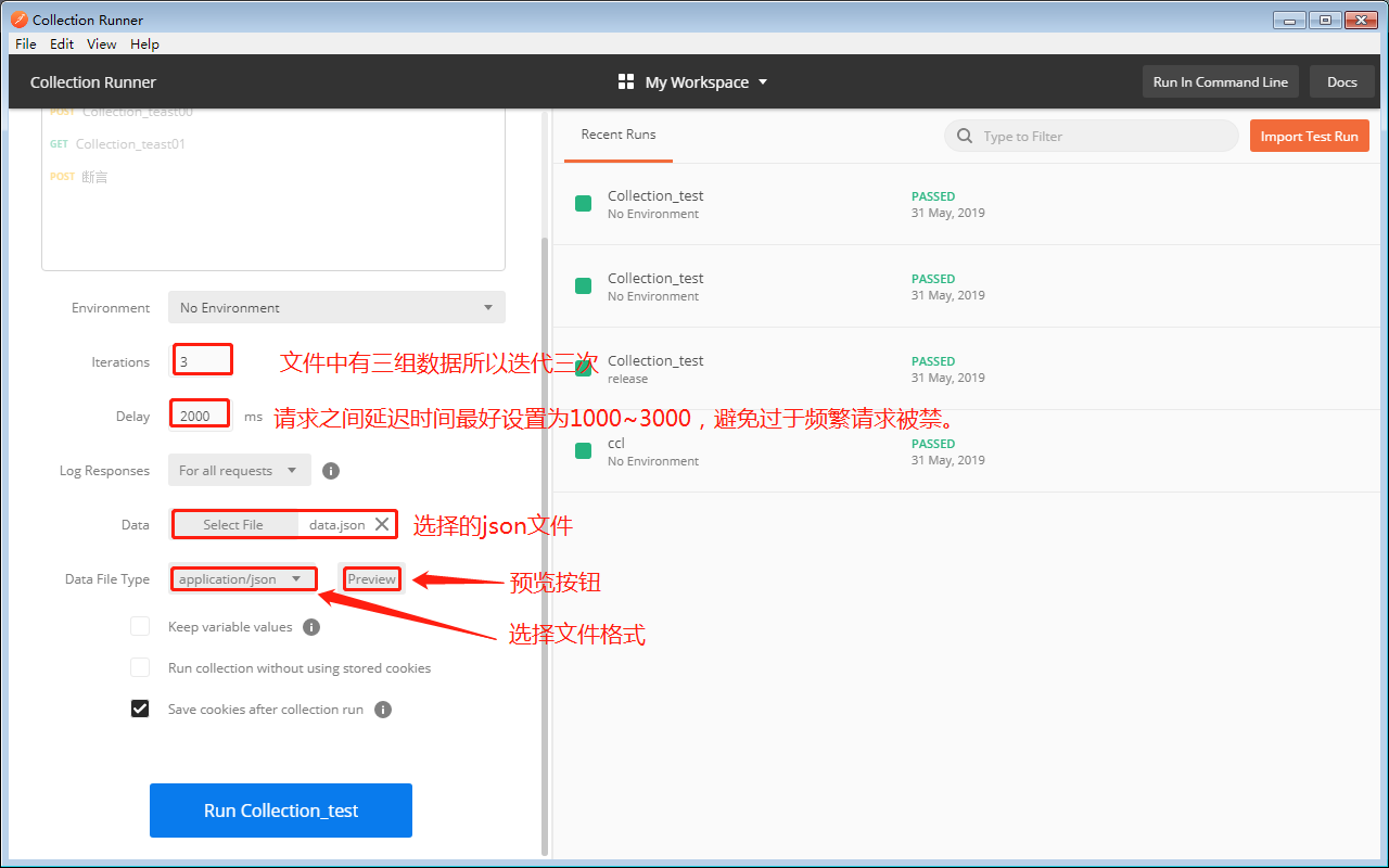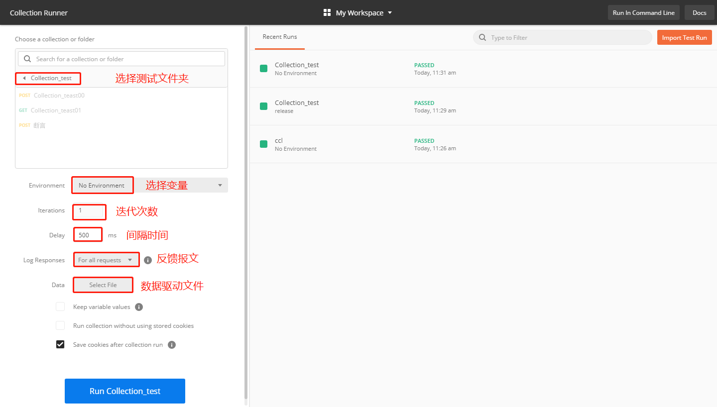 当我们想批量测试某个集合里面的各个API时,可以试用Collection Runner 来批量运行API,同时可以进行环境变量,迭代执行册数,延迟时间设置。