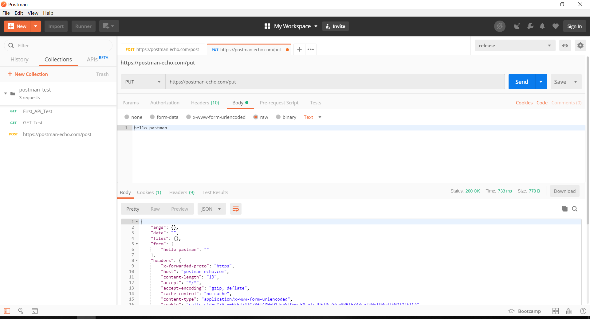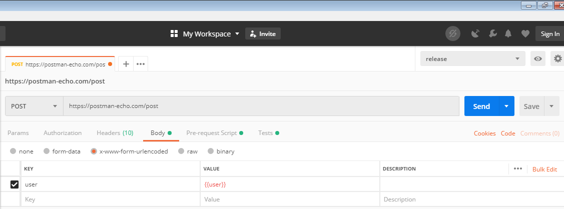 { "args": { "param": "test" }, "data": {}, "files": {}, "form": {}, "headers": { "x-forwarded-proto": "https", "host": "postman-echo.com", "content-length": "0", "accept": "*/*", "accept-encoding": "gzip, deflate", "cache-control": "no-cache", "cookie": "sails.sid=s%3A57aLbjtudZ0eAUQPTGkyqZR-k148qAzN.tS52N8wbompQ8tzqpFZnu%2Bq4x5KLy1tR9g%2FhIn9Ss7s", "postman-token": "be4d5653-949f-4ea1-b63a-8572d1a8ffb5", "user-agent": "PostmanRuntime/7.13.0", "x-forwarded-port": "443" }, "json": null, "url": "https://postman-echo.com/post?param=test" }