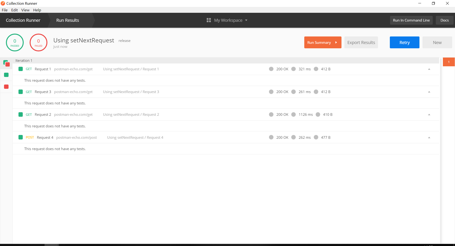 最直接的方法就是在集合中拖动顺序,但是每次去拖动比较麻烦,特别是当请求比较多的时候。这时最高效的方法就是通过脚本设置。首先下载官方提供的案例文件:collection.json导入到postman,运行Collection结果如图所示: