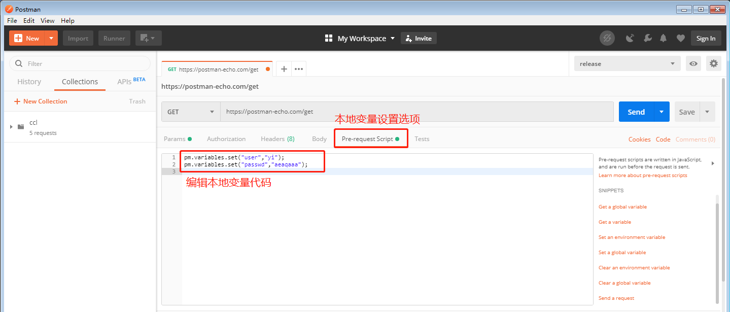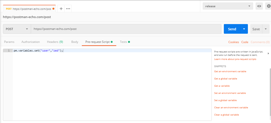 - pre-request Script(预置脚本)可以用来修改一些默认参数,在青丘发送之前执行。有点类似unittest框架中的seUP()方法。