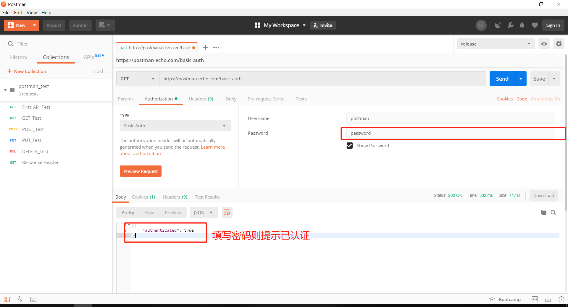 如果输入用户密码,选择Basic auth授权类型,则返回如下结果
