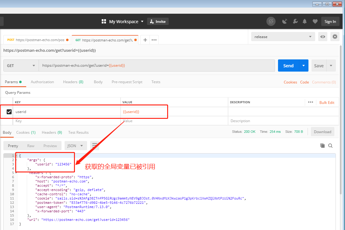 在实际接口测试中,接口经常会有关联。比如需要取上一个接口的某个返回值,然后作为参数传递到下一个接口作为参数。假设现在要获取A接口返回的userid值作为B接口的请求参数。