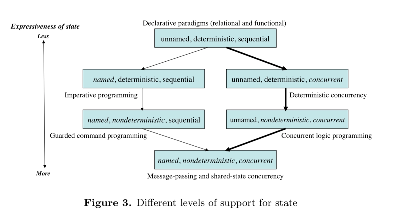 常见语言的层次结构有四层:严格的功能核心,然后是声明性并发,然后是异步消息传递,最后是全局具名状态。这种分层结构天然地支持四种范式。