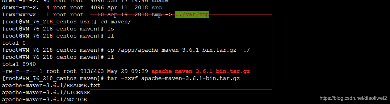 在 /usr/ 目录下建立maven目录,然后将maven.tar包放到/usr/maven/目录下,解压。