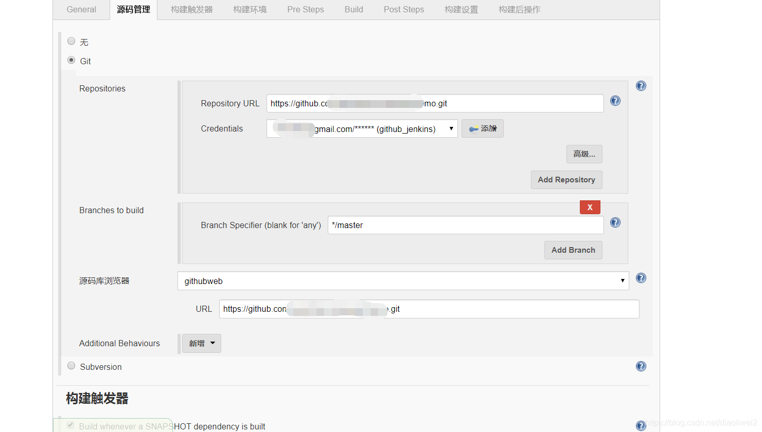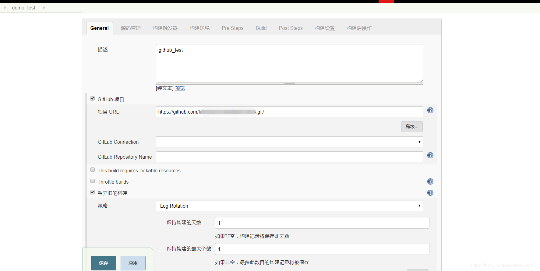 选择github项目,填写git地址。丢弃旧的构建,这里保持构建的天数1,保持构建的最大个数 1