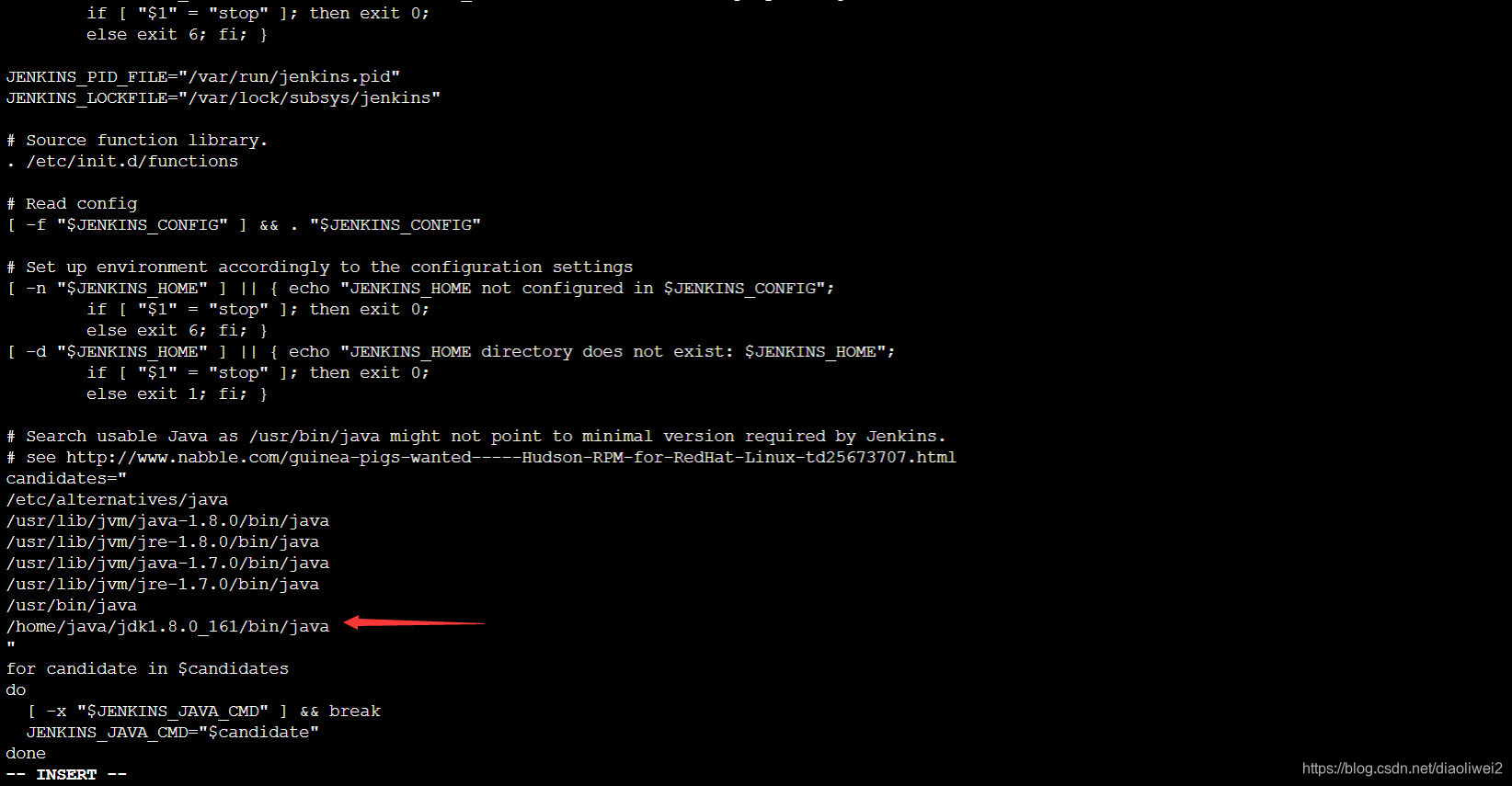 7、修改jenkins文件,添加jdk的目录: 当前的是:/home/java/jdk1.8.0_161/bin/java