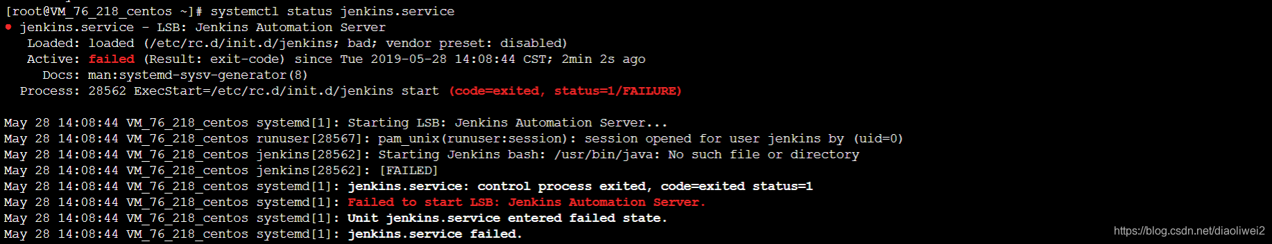 4、根据错误提示,输入:systemctl status jenkins.service