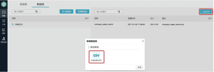 2.1 选择本地的csv文件,上传成功后,会自动创建数据集,