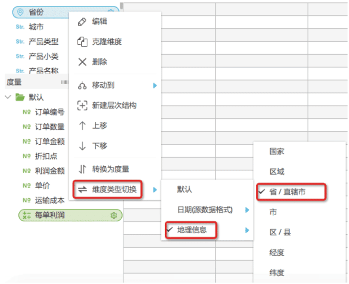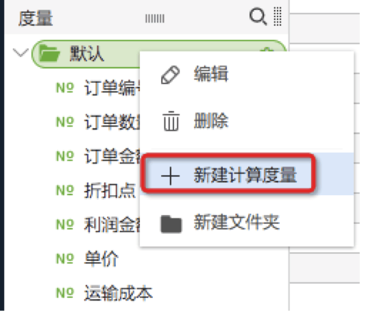 我需要对csv文件里的字段做些简单的计算,比如我需要算平均每单利润_元,于是我点击上图中的“编辑”,进入到数据建模中,右键选择【新建计算度量】