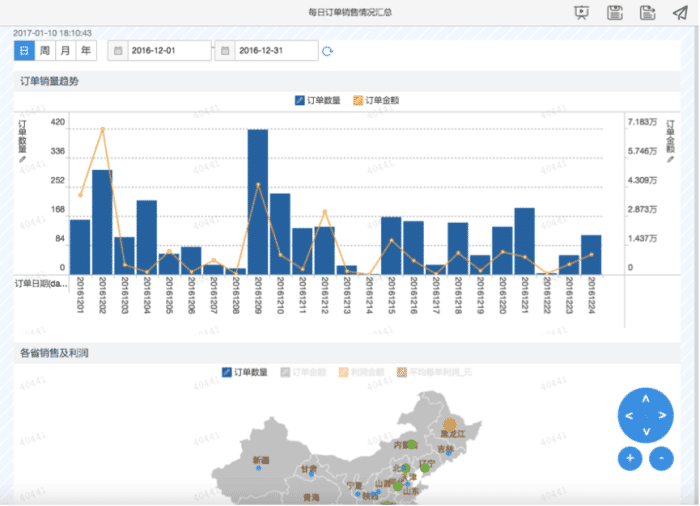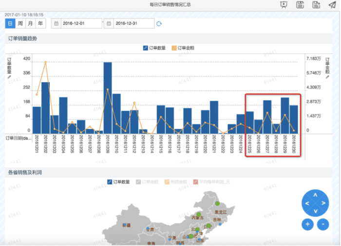 5)保存仪表板。效果展示如下:本csv文件中的订单数据是截止到2016.12.24.