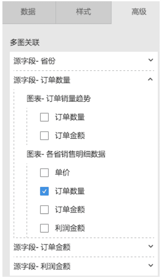 选中 气泡地图 图例——右侧配置的“高级”——多图关联,分别选择两个图例中对应显示的字段。如下图