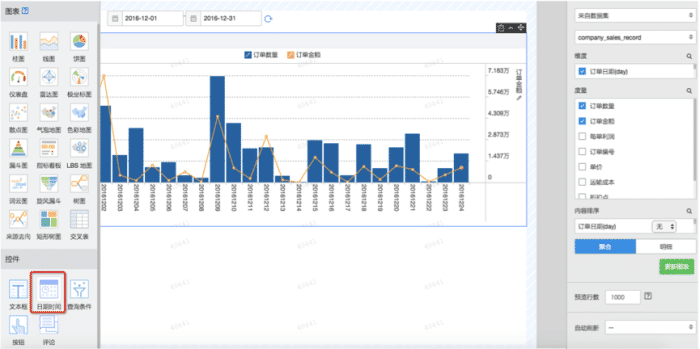 3)为方便按日期范围查询,拖入查询控件,并将日期控件设置为时间区间,图表展示见下图: