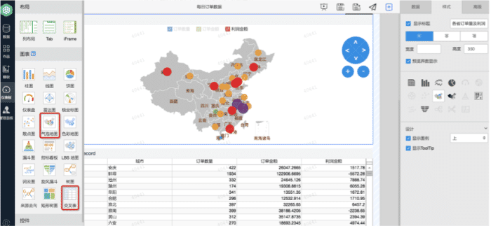 1)从左侧组件栏中拖入气泡地图和交叉表