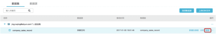 1)选择刚才保存的数据集:company_sales_record,配置数据源及显示的维度和度量,