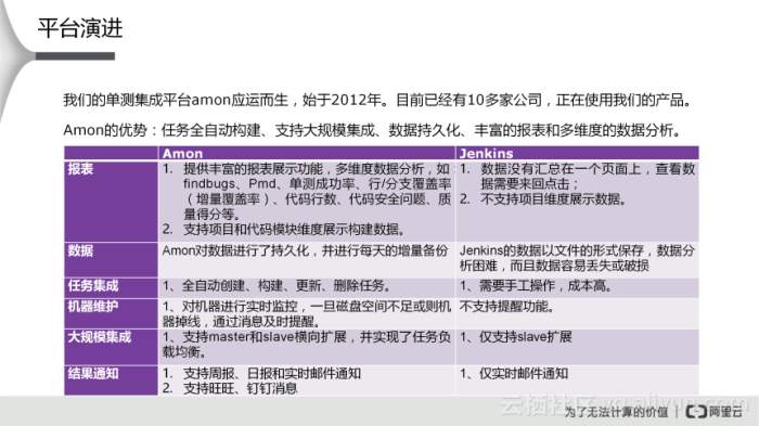 因此,单测集成平台Amon应运而生,它始于2012年,目前已有10多家公司,正在使用这一产品。Amon的优势在于其任务全自动构建,并支持大规模集成、数据持久化,具有丰富的报表和多维度的数据分析,Amon和Jenkins详细功能对比如上图所示,这里不再一一叙述。