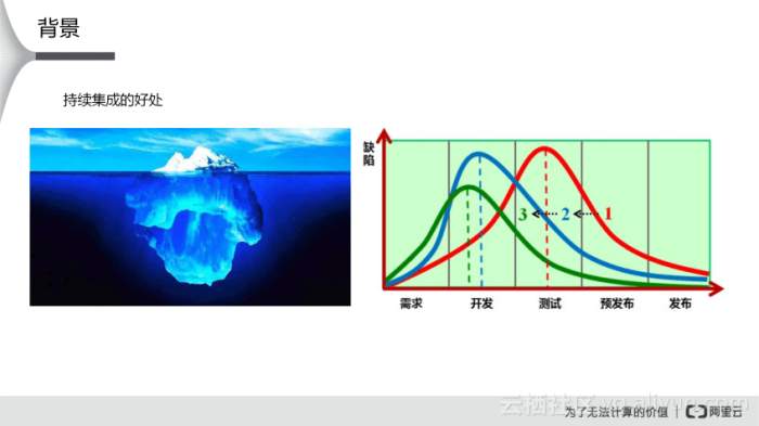 首先来看一幅图,大家应该都比较熟悉,冰山一角,如果把它移植到研发测试流程上面来讲,我们看的到的冰山,就好比开发阶段发现的Bug,比起海面以下的冰山,简直就是小巫见大巫。因此,持续集成给我们带来的直接好处,就是不断的发现海面以下的Bug,让我们能在开发阶段尽可能多的解决问题;其次,Bug越往后面发现,处理它的成本会越高,付出的代价也越大,因此,持续集成能帮助到我们降低项目研发成本;最后,如右侧图片所示,当持续集成不断的完善项目时,会潜移默化的推动着我们测试前移的动作,从没有集成的1,到集成初期的2,最终不断完善的集成3,成本越来越低、代码质量越来越高、发布时间越来越短 、从而使产品的品质越来越好。