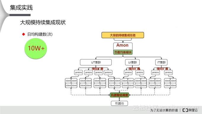 目前,阿里内部集成状况是支持10w+的日均构建数,平均每秒发生四次构建,这是一个非常庞大的量。我们的平台是如何来做支撑的呢?