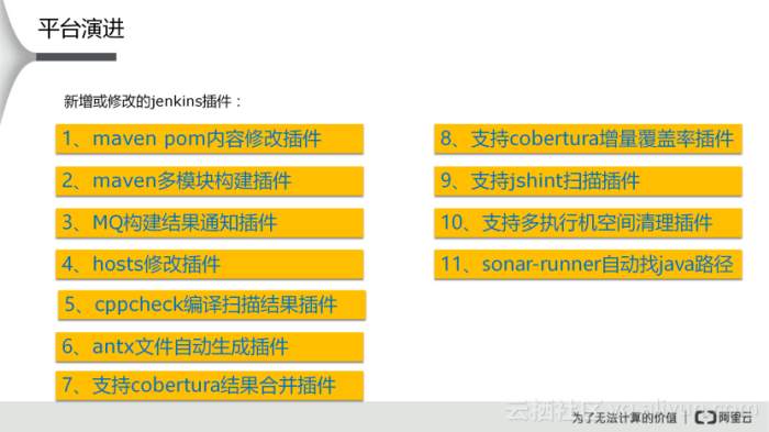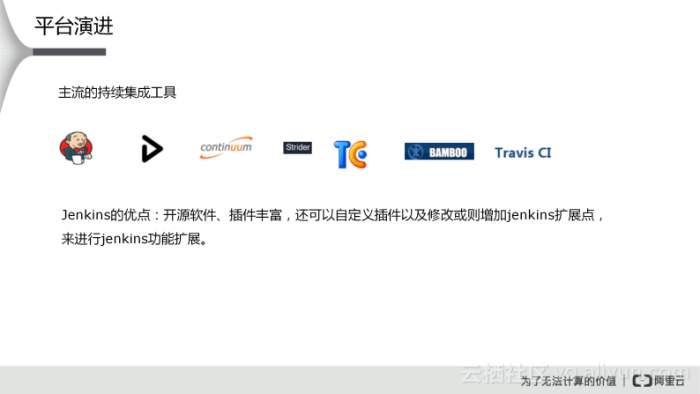 通过对上述持续集成工具的比较,阿里最终选择了Jenkins这一工具,Jenkins作为一款开源软件,有着丰富的插件(目前已达几百个),还可以自定义插件以及修改或增加Jenkins扩展点,来进行Jenkins功能扩展。
