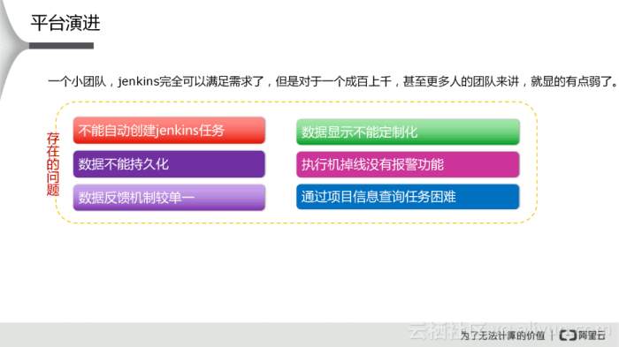 对于小团队而言,Jenkins完全可以满足需求了,但是对于一个成百上千,甚至更多人的团队来讲,就显得有点弱了。第一,Jenkins不能自动创建Jenkins任务,必须在Jenkins平台上手工创建,大大降低了集成效率,而且需要大家都掌握创建Job的方法以及Job上的配置,不利于工具推广;第二,其数据显示不能定制化,如果想要集成数据在一个页面上显示,那么Jenkins是无法满足这个要求的;第三,数据不能持久化,目前Jenkins的数据是通过文本的方式保存的,而且量很大,不利于数据维护和后续的数据分析;第四,执行机掉线没有报警功能,不会及时通知管理员及时处理;第五,数据反馈机制比较单一,Jenkins仅支持邮件的方式进行发送通知;第六,通过项目信息查询任务困难,Jenkins没有项目的维度,只有Job的维度,不方便查找。