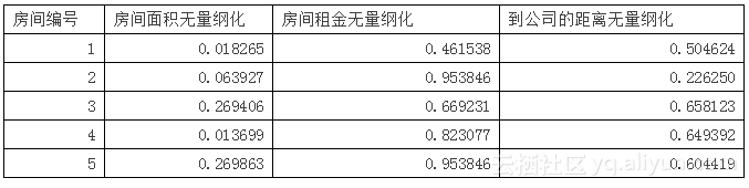 首先我过滤掉属性值超出我心理预期范围的房间,将价格大于等于2200元/月,面积小于等于8m2的房间过滤掉。过滤后的数据集中选5条数据如下: