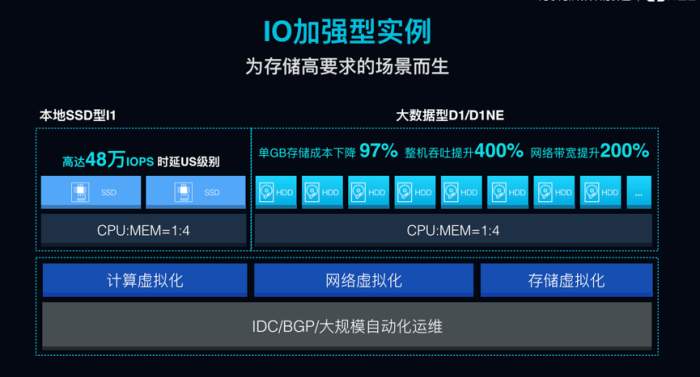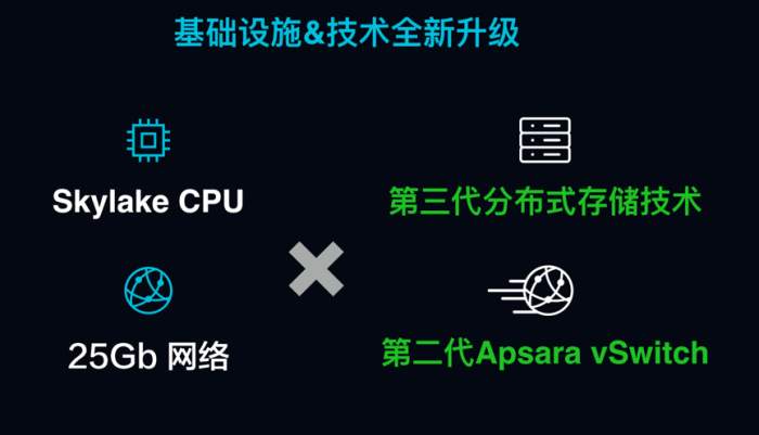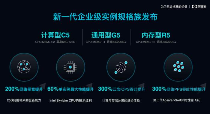 同时,基于全新一代的基础技术,阿里云新发布了计算型C5、通用型G5、内存型R5、高主频计算型HFC1、本地SSD型I2等数款实例。这一系列产品最高支持88核,704G内存。并通过25G基础网络带来了200%的网络带宽提升,基于Skylake带来单实例最高60%的计算性能提升,基于计算存储分离架构获得300%的云盘IOPS吞吐提升,基于Apsara vSwitch获得300%网络PPS吞吐性能提升。其中即将上线的I2在数据库垂直场景相较于I1提升至210万IOPS。
