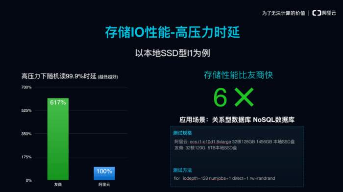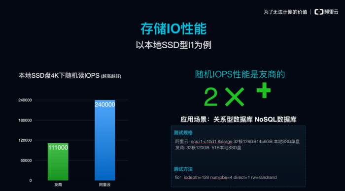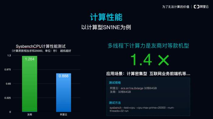 此次发布会,阿里云一改往日低调,一边是将测试环境搬到了发布会,用现场跑分的形式向媒体证明企业级ECS的性能。一边则在PPT里对某友商的产品进行了激烈的对比。
