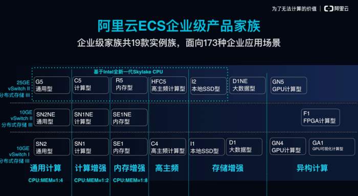 而企业级ECS得益于计算、存储、网络三驾马车的优化叠加,使之全新一代实例达到了当前行业的顶尖水平。Intel与阿里云有深入长远的CPU定制合作史,新产品家族采用的Skylake处理器也为云计算场景做了特别定制,各项性能首屈一指。存储领域进化为计算与存储分离的先进架构,SSD云盘单实例达到18万IOPS,包括Latency以及吞吐都跃进一层。此外,基础网络设施升级到25G。同时将底层网络虚拟化架构进行重构,全面升级到第二代Apsara vSwitch技术。在网络的PPS性能上达到了单实例 450万PPS,Latency降低了66%,实现媲美物理机的网络能力。