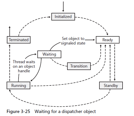 每个分发器对象都有一个等待列表,列表中一项代表一个等待该对象的线程。所以当线程向一个分发器对象发出信号,内核可以很快的确定谁在等待对象。