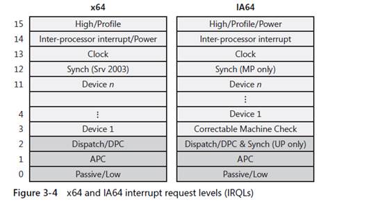 虽然中断控制器已经实现一层中断优先级,但是windows仍然强迫使用它自己的中断优先级方案,称为中断请求级别(IRQL)。