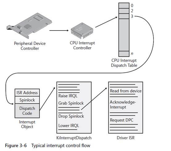 在windows锁支持的平台上,外部I/O中断进入中断控制器的一个引脚,该控制器在cpu的引脚上中断cpu。中断控制器将IRQ(中断请求)翻译成中断号,利用该中断号作为中断分发表的索引。并将控制权传递给恰当的中断分发例程。