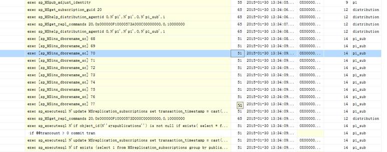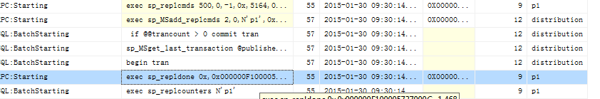 最后会修改订阅服务器中的MSreplication_subscriptions中的一些字段,其中最终要的是timestamp,这个字段表示现在订阅已经应用到了那个事务。奇特的事情又出现,会发现有2个update语句。不知道是不是为了版本兼容。
