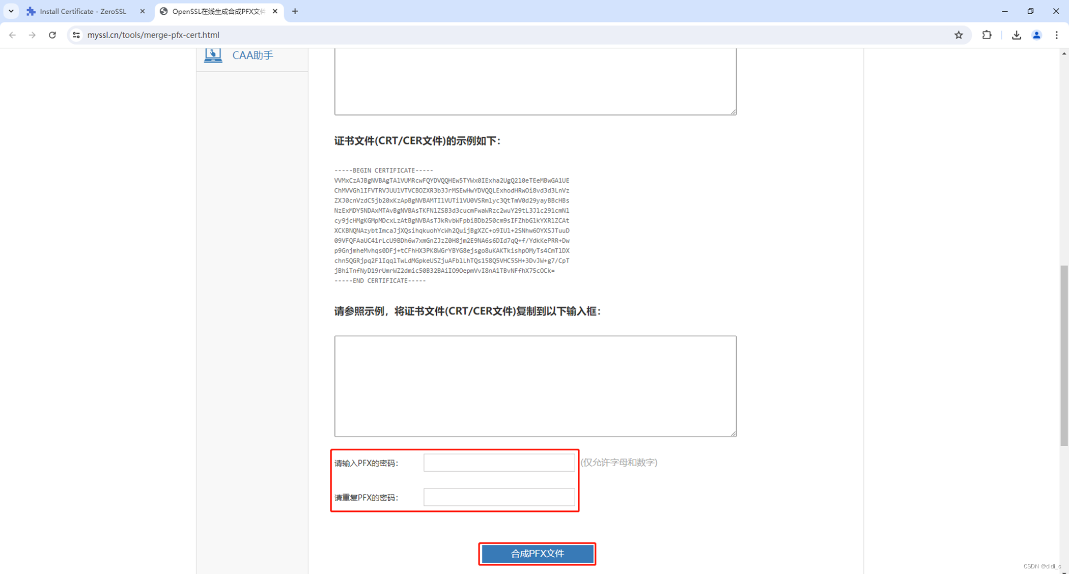11.因为给IIS安装Https证书,需要pfx文件,打开网站https://www.myssl.cn/tools/merge-pfx-cert.html进行转换