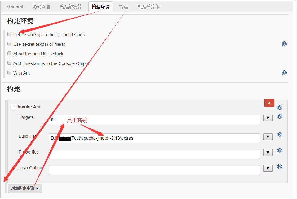 构建环境没有则不选择任何,构建先点击增加构建步骤,然后输入ALL(因为我的build.xml中的<project name="JmeterTest" default="all" basedir=".">),在build file输入build.xml的存放路径,点击保存