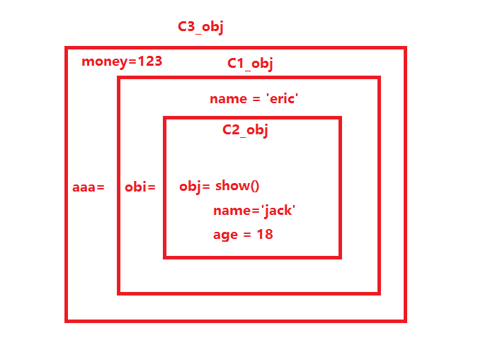 如果我们想通过c3_obj来执行show()方法的时候,首先我们看c3_obj有两个属性,money=123,aaa=c1_obj,没有show()方法,然后我们去找c1_obj对象。c1_obj对象中也没有show()方法,有obj=c2_obj,我们再去找c2_obj对象,c2_obj对象中有show()方法,执行show()方法:c3_obj.aaa.obj.show()
