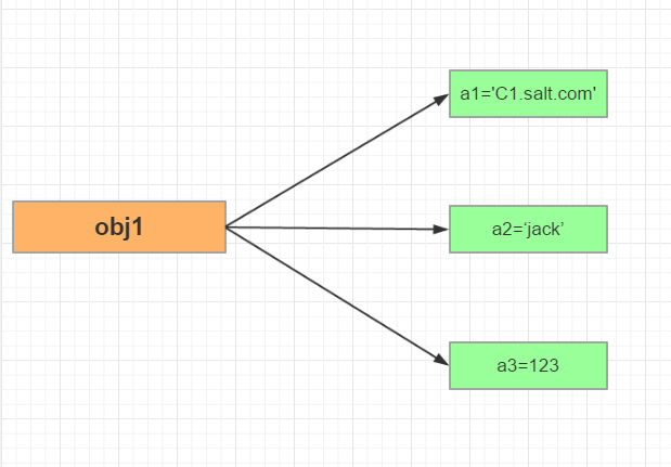 上面的例子中,self是一个形式参数,当执行obj1 = SQLHelper('C1.salt.com','alex',123)s时,self等于obj1;所以内容其实被封装到了对象obj1中,每个对象中的属性都会先存在内存里,类似下面这种方式保存: