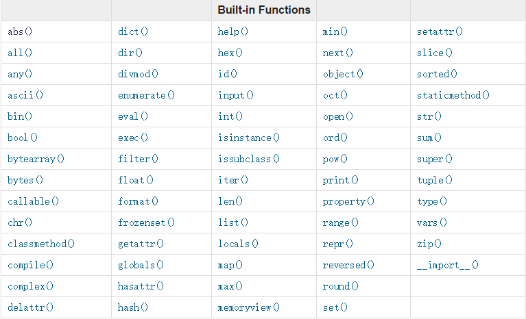 今天来介绍一下Python解释器包含的一系列的内置函数,下面表格按字母顺序列出了内置函数: