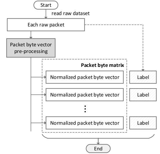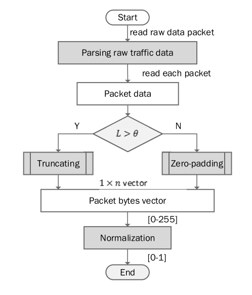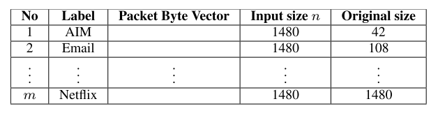 截断和零填充是为了固定输入到分类器的每个数据包的大小。所提出的基于深度学习的分类器要求所有输入的大小相等。特别是,将n定义为DataNet的目标输入大小,其中0 < n < 1500。最大传输单元的大小为1500字节。输入包被截断或填充为零,这取决于它与n相比的长度。