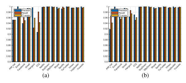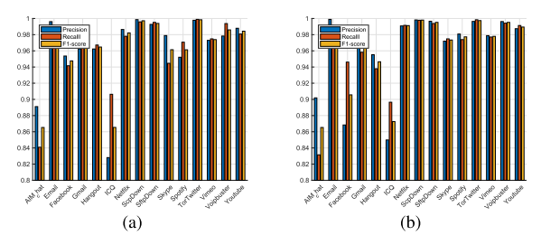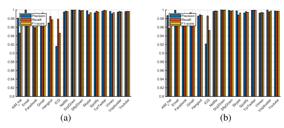 基于MLP的数据网的评估结果如图12所示。从完整数据集训练的MLP数据网在大多数应用中实现了高精度,如图12(a)所示。具体来说,Email、Netflix、ScpDown、sftpown和TorTwitter接近100%。AIM-Chat和ICQ的精度相对较低,分别为88%和83%。相似地是,召回率和F1分数对于除了AIM_Chat和ICO的大部分应用都很高。大多数应用程序的三个指标的平均结果为96%。相比之下,从平衡数据集训练的MLP数据网具有相对较低的性能。事实上,使用从平衡数据集训练的MLP数据网,Spotify分类的召回率甚至低于80%。