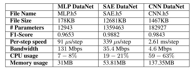 我们评估这三种类型的数据网的计算性能。在不丧失通用性的情况下,使用从平衡数据集训练的三个数据网进行评估。对每个数据网进行50次测试。每个测试记录150000个数据包分类的计算性能。通过相对强大的配置,例如设置用于训练的配置,可以对带宽超过100mbps的家庭网络实时执行分类过程,如表5所示。