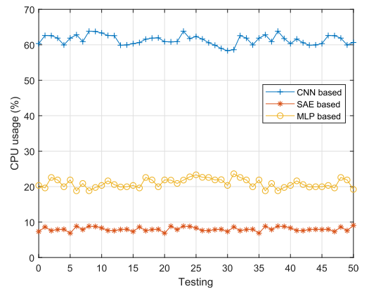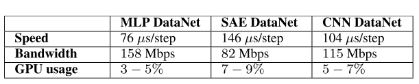 由于方案的不同复杂性,CPU和内存的使用可能会有所不同。如图15所示,基于MLP的数据网在三种方案中消耗最少的计算资源,从而为实时处理提供最大的带宽。我们将进一步研究这一问题,以便在今后的工作中取得更好的成绩。