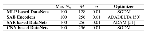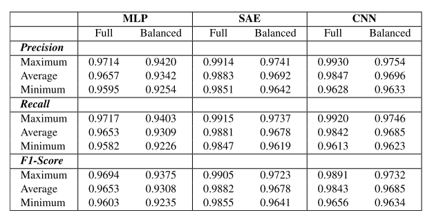 我们首先创建两组分别从完整数据集和平衡数据集训练的数据网。每组评估由三种方法训练的三个数据网组成,即基于MLP、SAE和CNN的方法。每个训练过程使用60%用于训练,20%用于验证,20%用于测试。对SDH-HGW的分组分类器,共评估了6个数据网的精度。三种方法的设置见表3。