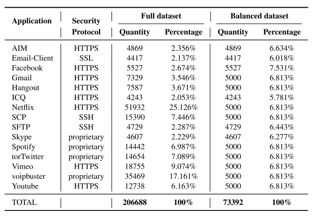 用于评估的数据集由15个应用程序组成,如Facebook、Y outube、Netflix等。所选应用程序使用各种安全协议加密,包括HTTPS、SSL、SSH和专有协议。所选数据集中总共包括206688个数据包。为了减少不平衡数据集[43]的影响,例如Netflix占总数据集的25.126%,我们进一步为每个应用程序创建一个包含更多平衡数据样本的子集。平衡子集共有73392个数据包。它由相同的15个应用程序组成,每个类约占整个子集的6.18%。