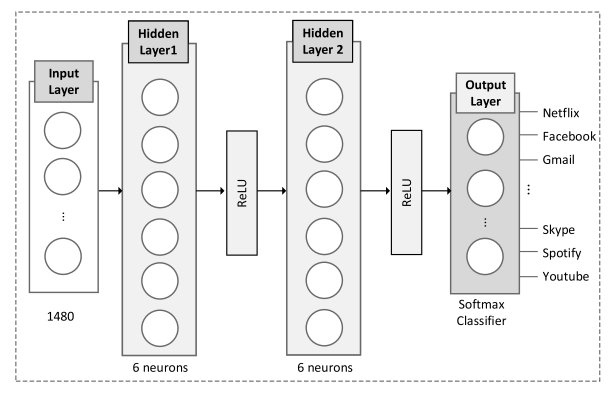 为了保护用户隐私,许多应用程序都应用了安全协议,如HTTPS、SSH、SSL等[17]、[18]。现有的应用软件解决方案大多是基于数据包检测(DPI)和机器学习(ML)。然而,这些解决方案无法提供准确的实时流量分类加密网络应用程序[19]-[22]。在这项工作中,我们使用三种方法来设计和开发数据网(即加密数据包分类器):多层感知器(MLP)、叠层自动编码器(SAE)和卷积神经网络(CNN),基于从“ISCX-VPN-nonVPN”加密流量数据集中选择的数据集[23]。作为概念上的证明,所选数据集包含来自15种应用程序的20000多个数据包。实验结果表明,所开发的数据网能够为分布式家庭网络中的SDN-HGW提供实时、细粒度的应用感知。这项工作的主要贡献总结如下:
