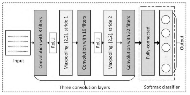 我们提出的分组分类器的CNN结构如图9所示。它由三个卷积层、两个Maxpooling层和一个以Softmax为分类器的全连接层组成。由于输入数据包被转换成二维(2D)矩阵,因此我们将放弃深度并专注于处理2D数据。分类过程定义如下: