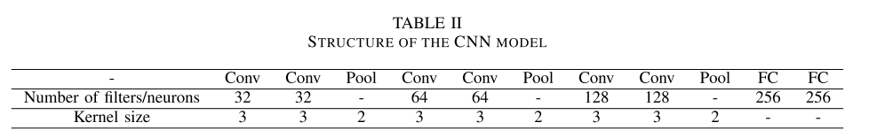 我们的方法的总体架构如图4所示。模型参数详见表2。我们使用最大池化,因为它通常比其他池方法更受欢迎。修正线性单元(ReLU)激活在整个模型中用作激活函数,除了包含Softmax的最后一层。