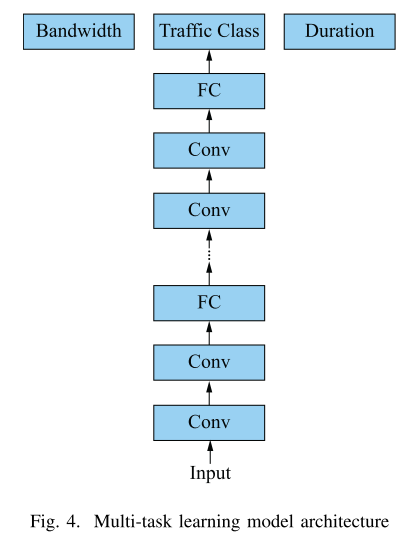 最常见的多任务学习方法是硬参数共享,其中一些深度学习模型的参数在任务之间共享,一些参数保持任务特定[23]。我们的硬参数共享模型在第4-D节中进行了说明。多任务学习模型比多个单任务学习模型更有效,因为在MTL数据集中,所有任务都可以帮助更好地学习所有其他任务。在本文中,我们将证明,使用多任务学习方法可以提高流量分类任务的准确性,在这种方法中,其他任务的数据很容易获得,即预测流量的带宽和持续时间。因此,在训练MTL框架时,当使用大量其他任务的数据时,流量分类任务的准确性显著提高。