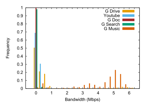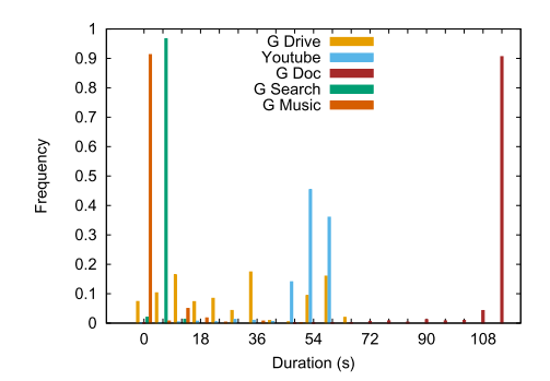 为了更好地了解带宽和持续时间的分布,我们分别在图2和图3中说明QUIC数据集类的带宽和持续时间直方图。对于带宽,一个类(G音乐)相当消耗更多的带宽,并且大多大于1mbps,而其他类在1kbps到1mbps之间变化。G音乐带宽之所以大得多,是因为它在播放时试图下载整个曲目。通过观察图3中G音乐流的持续时间,这一点更加明显,图3显示了G音乐流的非常短暂的性质。尽管在某些地区存在重叠,但不同类的持续时间是相对不同的。请注意,根据数据集、应用程序和ISP的需要,带宽和持续时间分类可能会从一种方案更改为另一种方案。